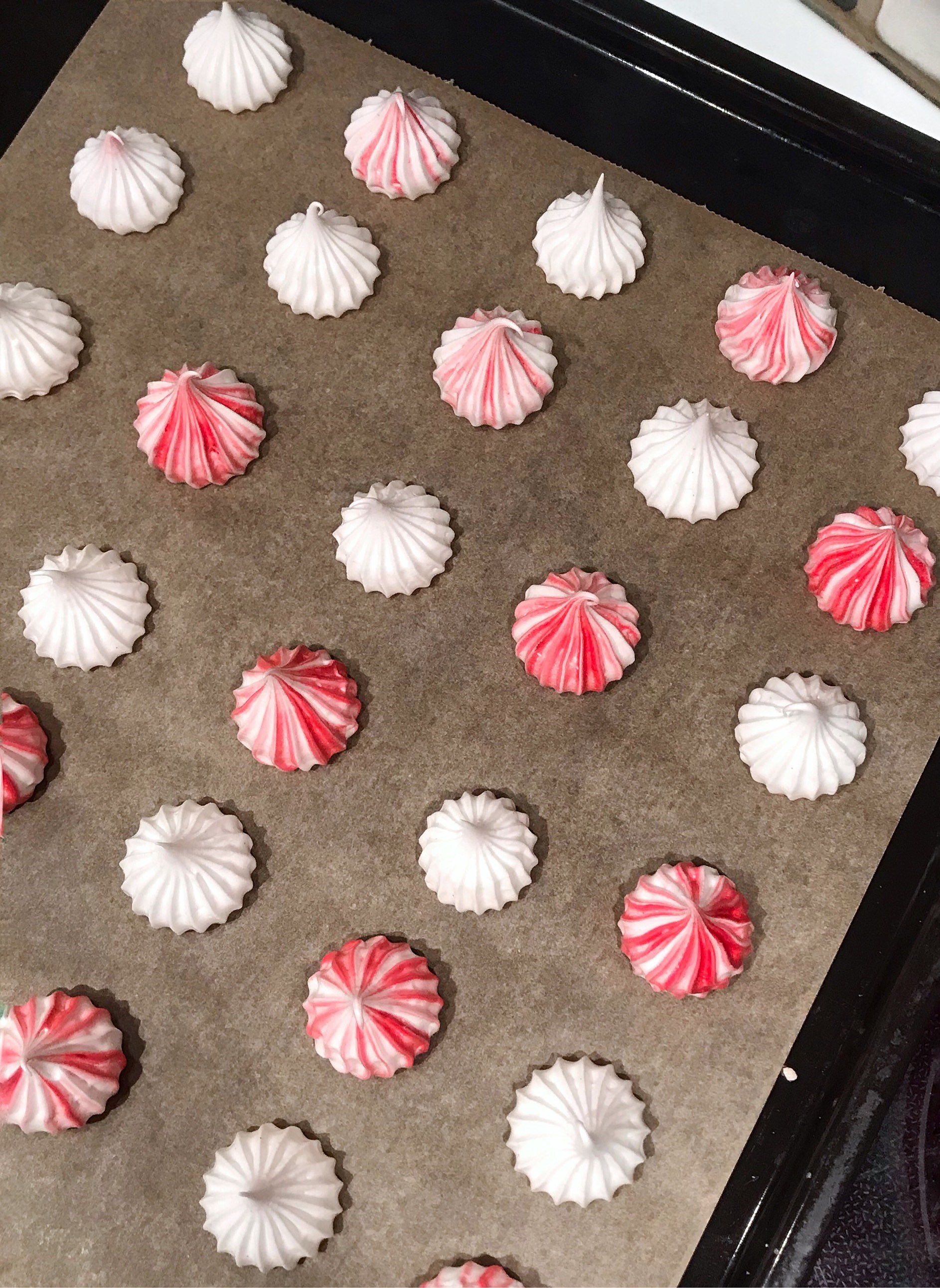 6. Spritsa ut jämnstora maränger och grädda sedan längst ned i ugnen i 1 timme, sänk sedan värmen till 50°C och grädda i ytterligare 45 min. Marängerna ska lossna lätt från bakplåtspappret när de är färdiga. Stäng sedan av ugnen men låt marängerna vara kvar i minst 2 timmar.