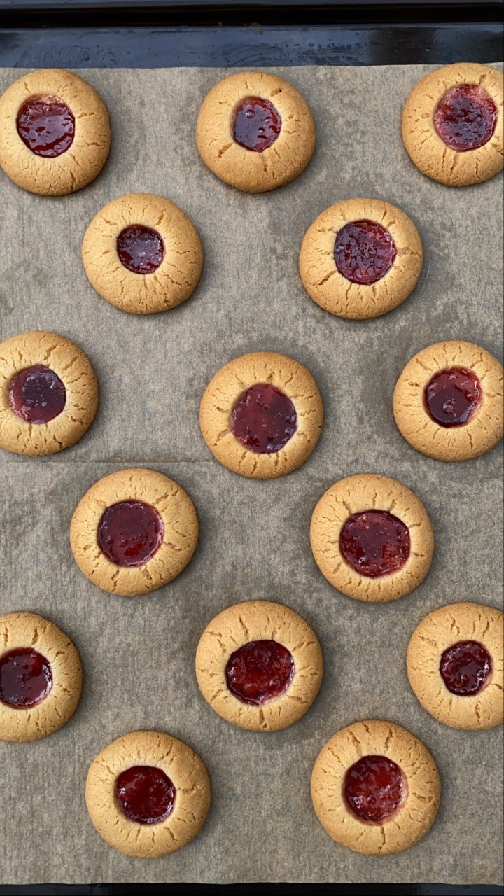 6. Gör en fördjupning i varje boll, använd ett finger eller t.ex. en träslev med runt handtag. Lägg sedan dit en klick hallonsylt. (Tips! Ställ in bollarna fyllda med sylt i kylen en stund före gräddning så flyter dem ej ut/blir platta under gräddning)