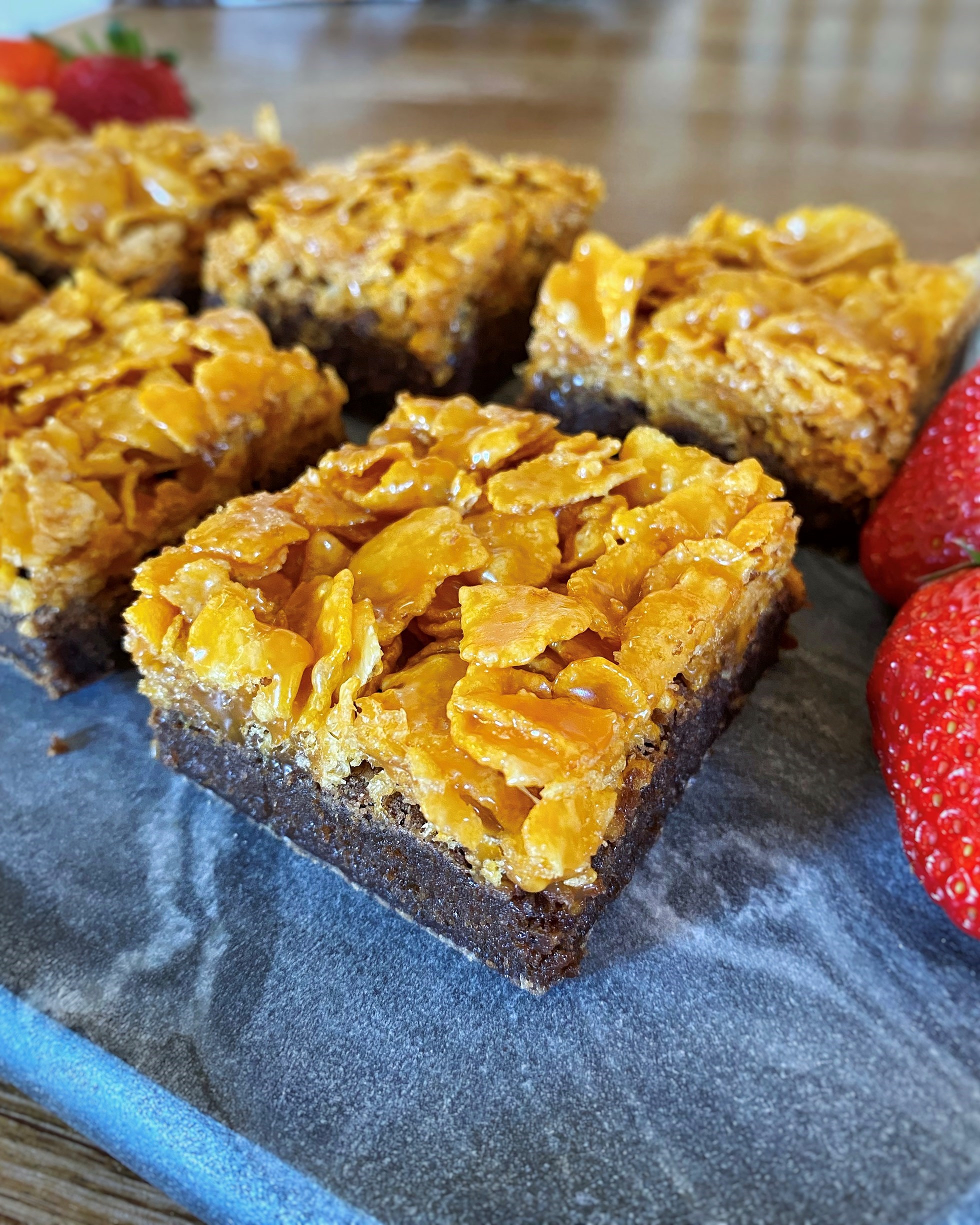 Okej, den här kakan hörni…. wow, säger jag bara. Brownie är ju bland det godaste jag vet, och jag älskar verkligen att kombinera olika smaker och texturer. För ett tag sedan gjorde jag en brownie med popcorn i salt kolasås, vilket var jättegott (såklart) men min mamma är inte jätteförtjust i popcorn så då började jag fundera på vad jag kunde byta ut popcorn mot. Och då fick jag idéen att använda cornflakes istället, och det gick ju huuuur bra som helst! Helt klart en ny favorit. En underbar, chokladig brownie toppad med krispiga cornflakes i en drömgod salt kolasås. En helt fantastisk kombination, ni bara MÅSTE testa! 😍