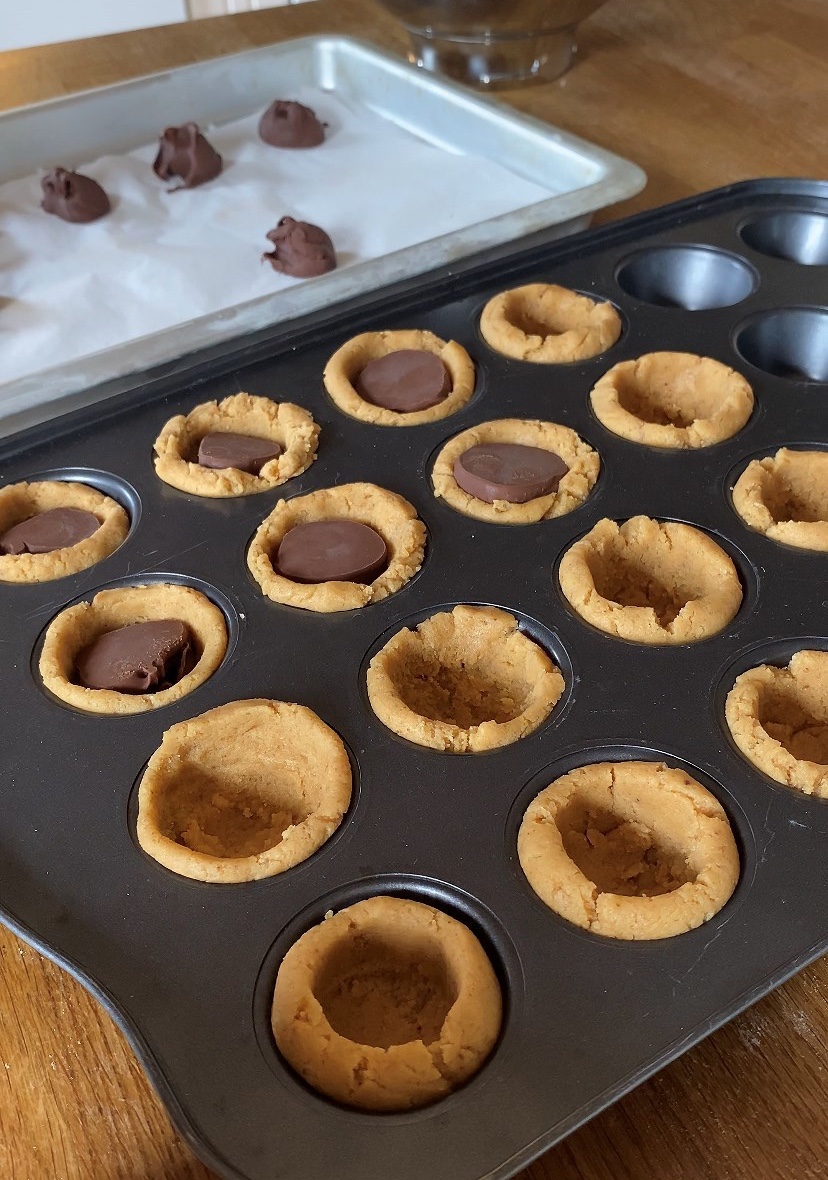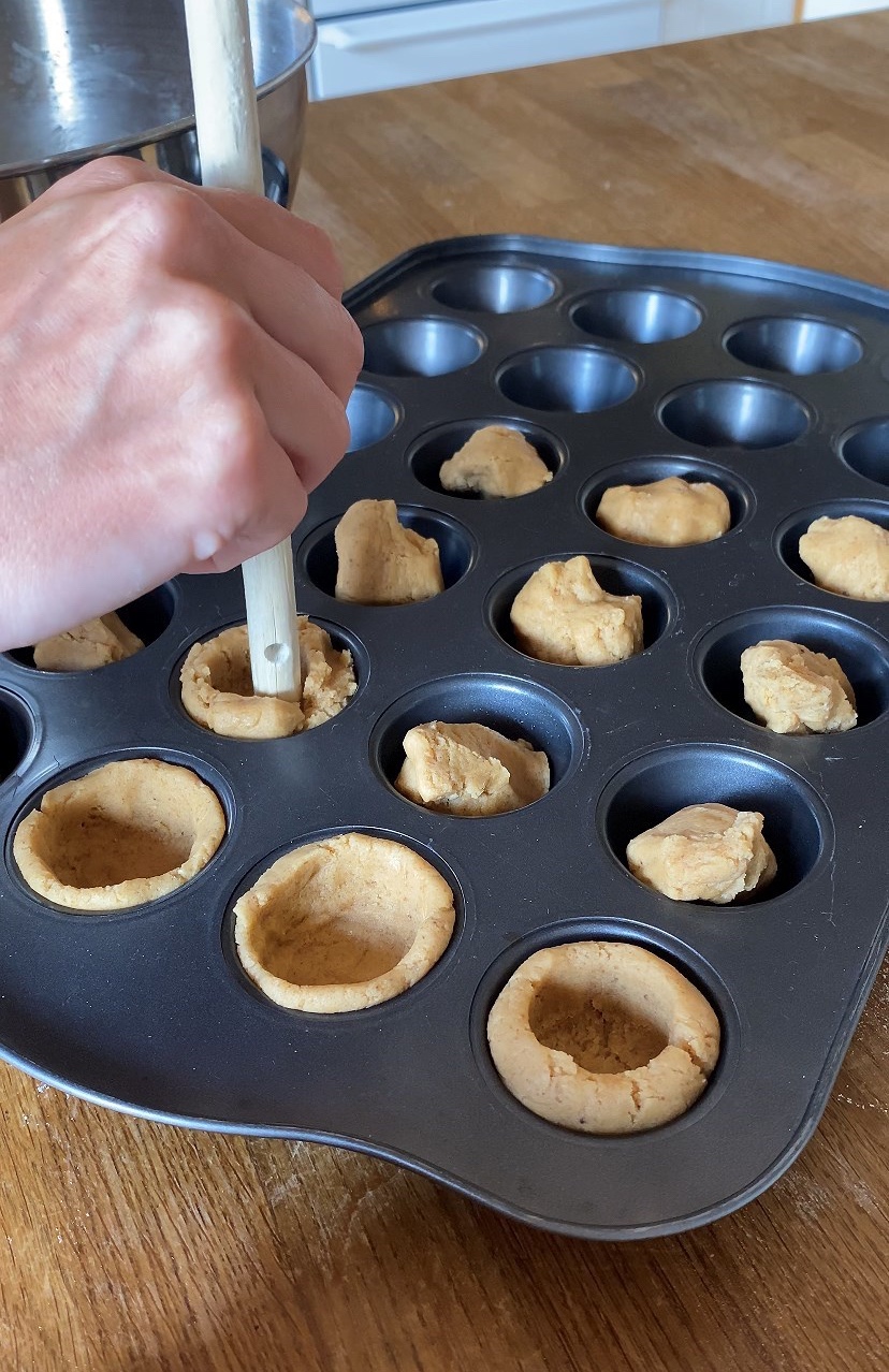- Gör 16 bollar och lägg i muffinsformen. Tänk på att du ska ha lite mindre än hälften av degen kvar som du ska använda lite senare. Gör sedan en grop med ditt finger eller med en träslev som har ett runt handtag. När du gjort alla gropar så kan du ta ut nutellan från frysen. Lägg sedan en nutella i varje grop. Obs! Tänk på att nutellan smälter ganska snabbt så försök arbeta fort.