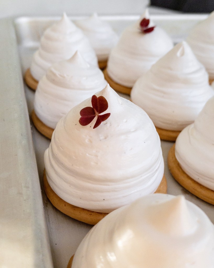 - När sockerlagen når 118 grader så häller du ned sockerlagen i äggvitorna i en tunn stråle samtidigt som du vispar på hög hastighet. Försök att inte nudda varken skålen eller själva vispen under tiden som du häller i sockerlagen.