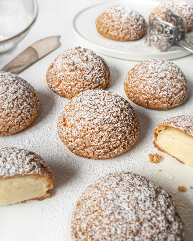 - Montering: Gör ett litet hål i botten av varje choux au craquelin. Häll upp diplomatkrämen i en spritspåse, klipp ett hål ca 1 cm i diameter, och stoppa sedan in spritspåsen i bollarna och fyll. Fyll de tills du känner att de blivit helt fyllda, dra sedan försiktigt ur spritspåsen. Pudra på florsocker och sedan är dina choux au craquelin klara!