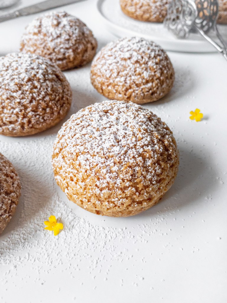- Ta fram mördegen och stansa ut 9 cirklar som är ca 4,5 cm i diameter. Lägg de på Pâte à choux bollarna. Grädda i mitten av ugnen i ca 30 minuter. Öppna inte ugnsluckan under tiden de gräddas, då kan de sjunka ihop. Ta ut och låt svalna helt.