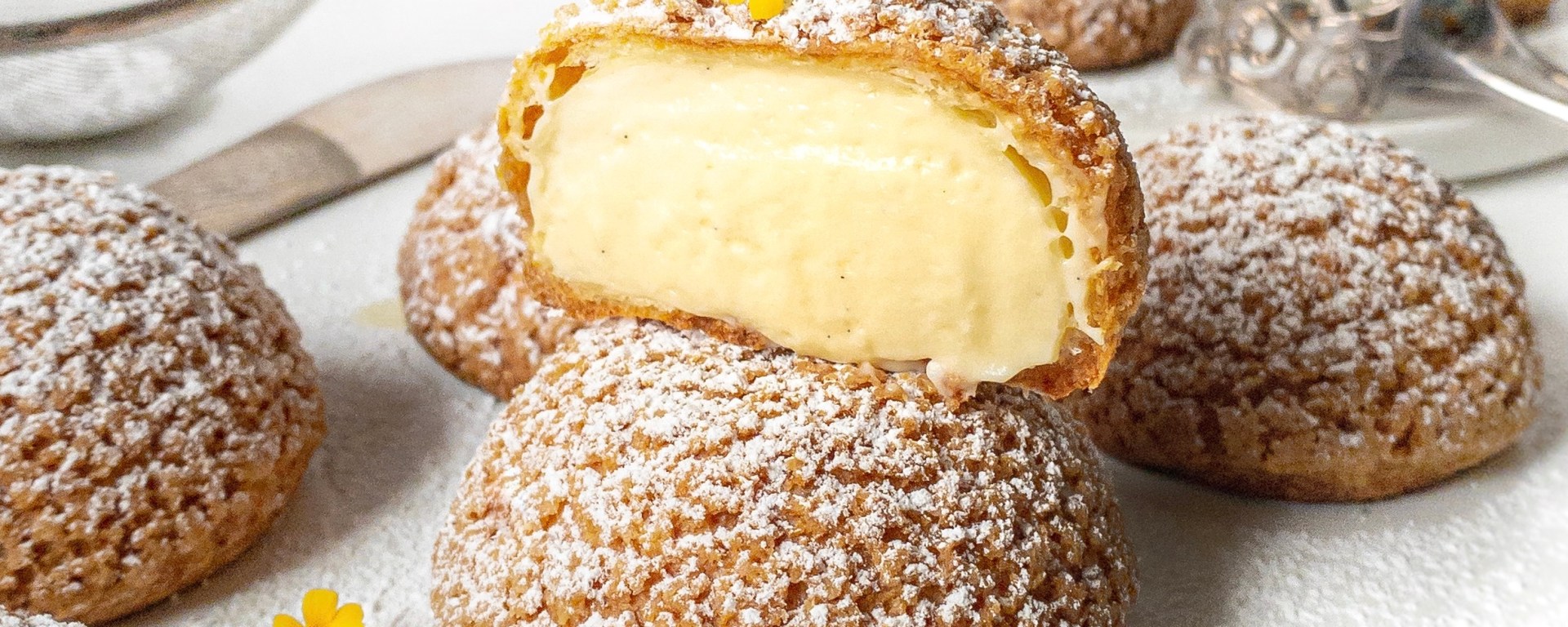 - Montering: Gör ett litet hål i botten av varje choux au craquelin. Häll upp diplomatkrämen i en spritspåse, klipp ett hål ca 1 cm i diameter, och stoppa sedan in spritspåsen i bollarna och fyll. Fyll de tills du känner att de blivit helt fyllda, dra sedan försiktigt ur spritspåsen. Pudra på florsocker och sedan är dina choux au craquelin klara!