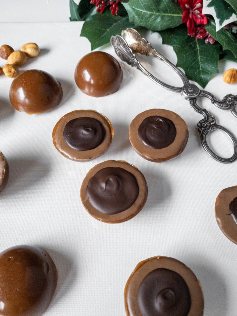 Något som jag verkligen förknippar med jul är alla chokladaskar som är ett obligatorisk tillbehör på gottebordet. Ni vet, Alladin, Paradis, lindt, Merci, toffifee osv… Det här året ville jag prova att göra egen toffifee, för det är ju inte alls särskilt svårt egentligen! Ett skal av härlig, seg kola och fylld med en rostad hasselnöt och silkeslen nougat. Och så en liten klick mörk choklad på ytan. Helt klart mitt nya favoritgodis, och det smakar precis som den man köper – om inte godare! Ni bara måste prova!