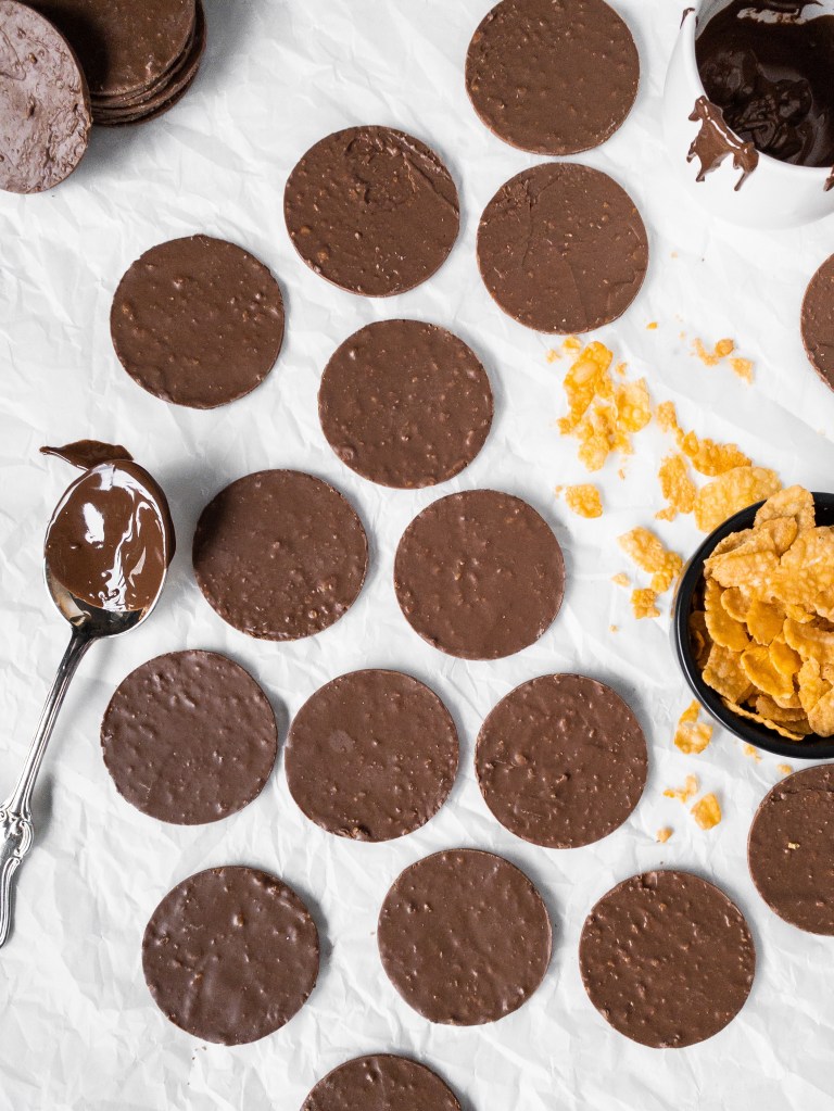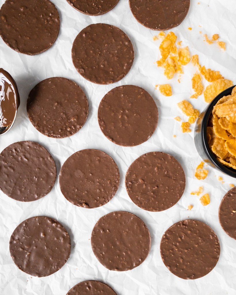 - Blanda ned de finkrossade cornflakesen i chokladen. Häll sedan ut på bakplåtspappret och bred ut till ett tunt lager. Låt sedan stå i rumstemperatur tills det nästan har stelnat helt, då stansar du ut rundlar med en rund utstickare. Låt sedan stelna helt och hållet innan du lyfter väck rundlarna. Förvara på ett svalt ställe eller i kylskåpet.