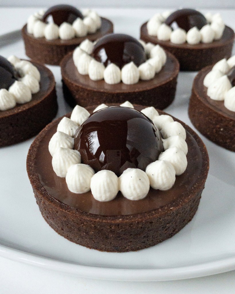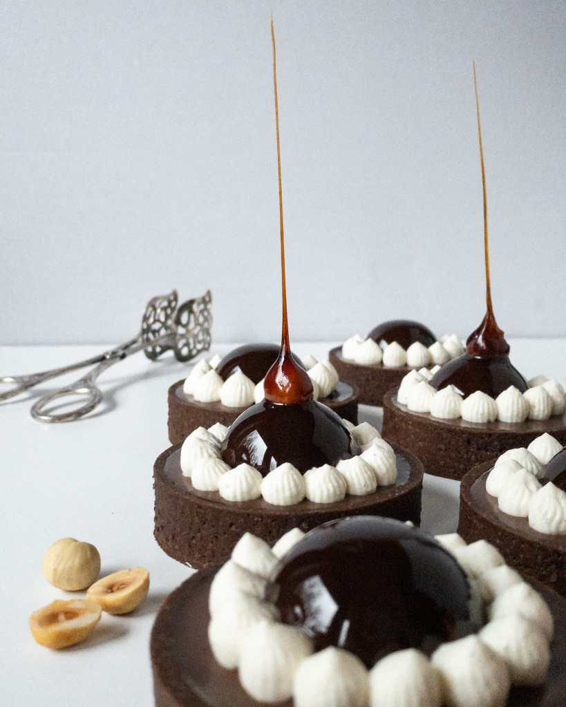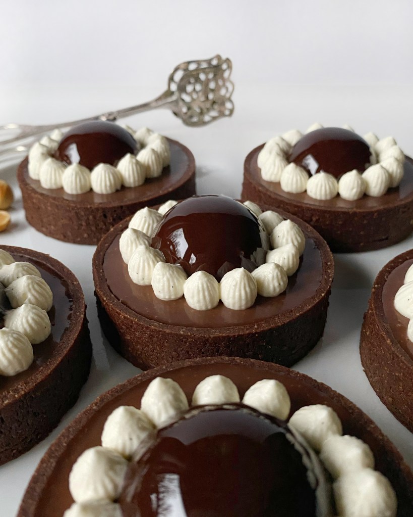 Lyxiga tarteletter med choklad och salt kola. Pajskalet består av en sablédeg (fransk mördeg), och inuti pajen finns ett lager med salt kola och ett lager med en len och krämig chokladganache. Kupolen som ligger på pajen innehåller en nutellamousse som är täckt med en mirror glaze, och sist men inte minst så har jag spritsat vaniljchantilly (grädde smaksatt med vanilj) samt dekorerat med en hasselnöt doppad i karamell.