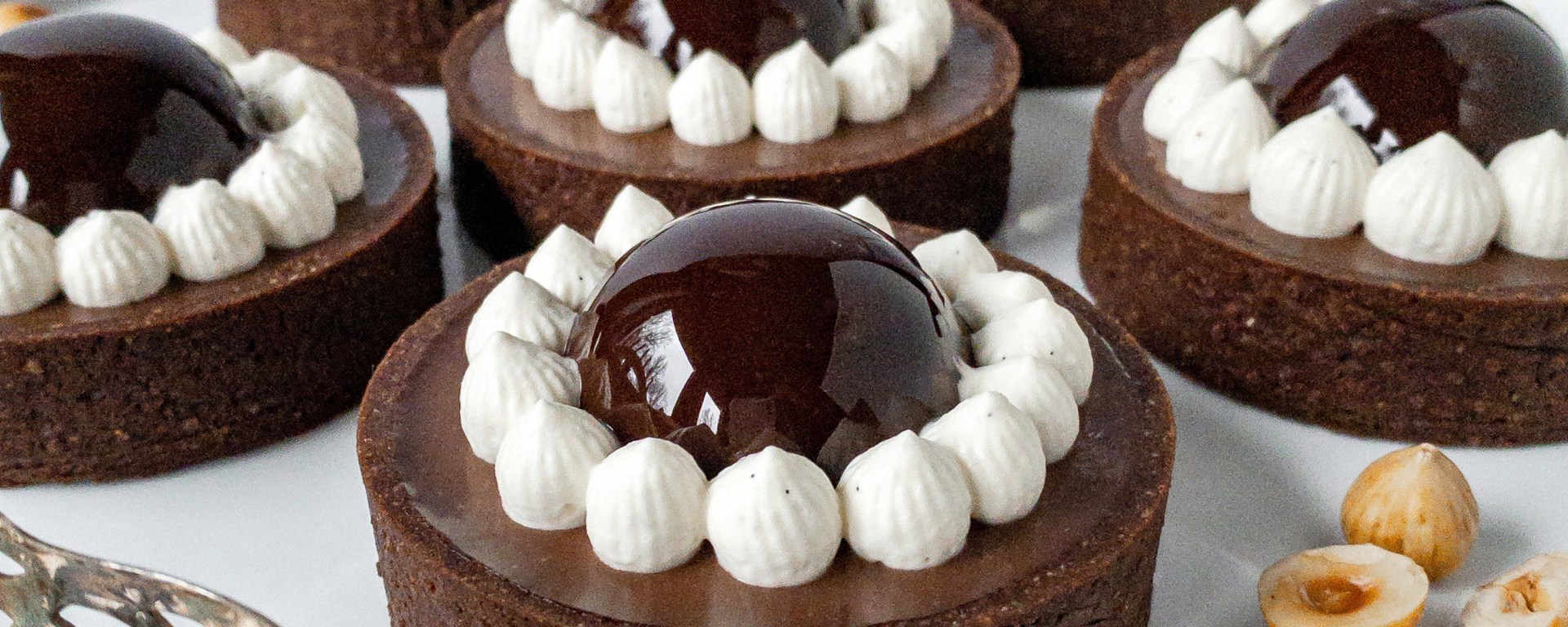 Lyxiga tarteletter med choklad och salt kola. Pajskalet består av en sablédeg (fransk mördeg), och inuti pajen finns ett lager med salt kola och ett lager med en len och krämig chokladganache. Kupolen som ligger på pajen innehåller en nutellamousse som är täckt med en mirror glaze, och sist men inte minst så har jag spritsat vaniljchantilly (grädde smaksatt med vanilj) samt dekorerat med en hasselnöt doppad i karamell.