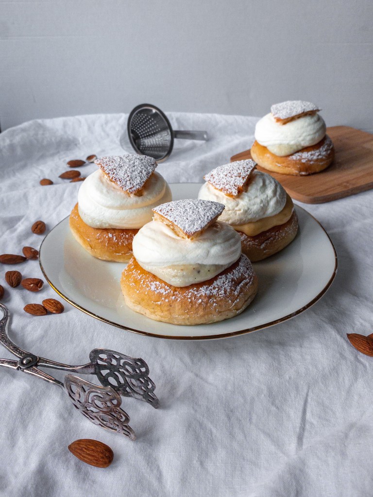 - Klipp/skär ett lock i bullarna. Lägg i mandelfyllningen. Vispa grädde och spritsa på semlorna, lägg på locket och pudra florsocker över semlorna. Servera!