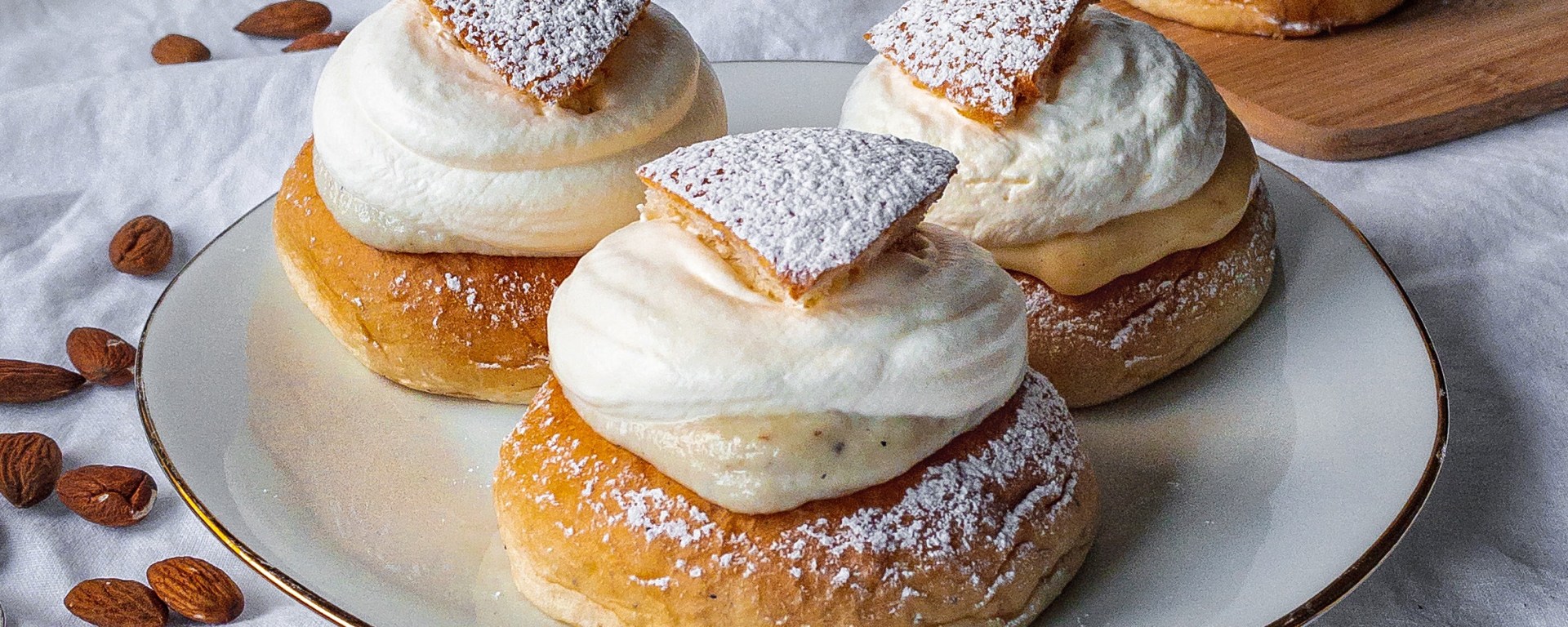 - Klipp/skär ett lock i bullarna. Lägg i mandelfyllningen. Vispa grädde och spritsa på semlorna, lägg på locket och pudra florsocker över semlorna. Servera!