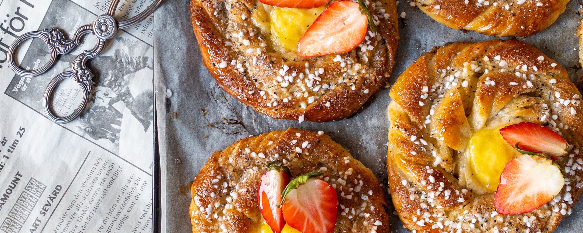 - Pensla bullarna med ägg och strö på pärlsocker främst på ”kanterna”. I mitten gör du försiktigt en liten grop där du spritsar/lägger en klick med vaniljkräm.