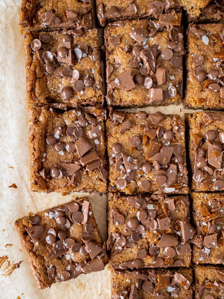 De blir mjuka och underbart sega inuti. Fullproppade med bitar av choklad och toppade med daim, chokladknappar och flingsalt. Så galet gott!