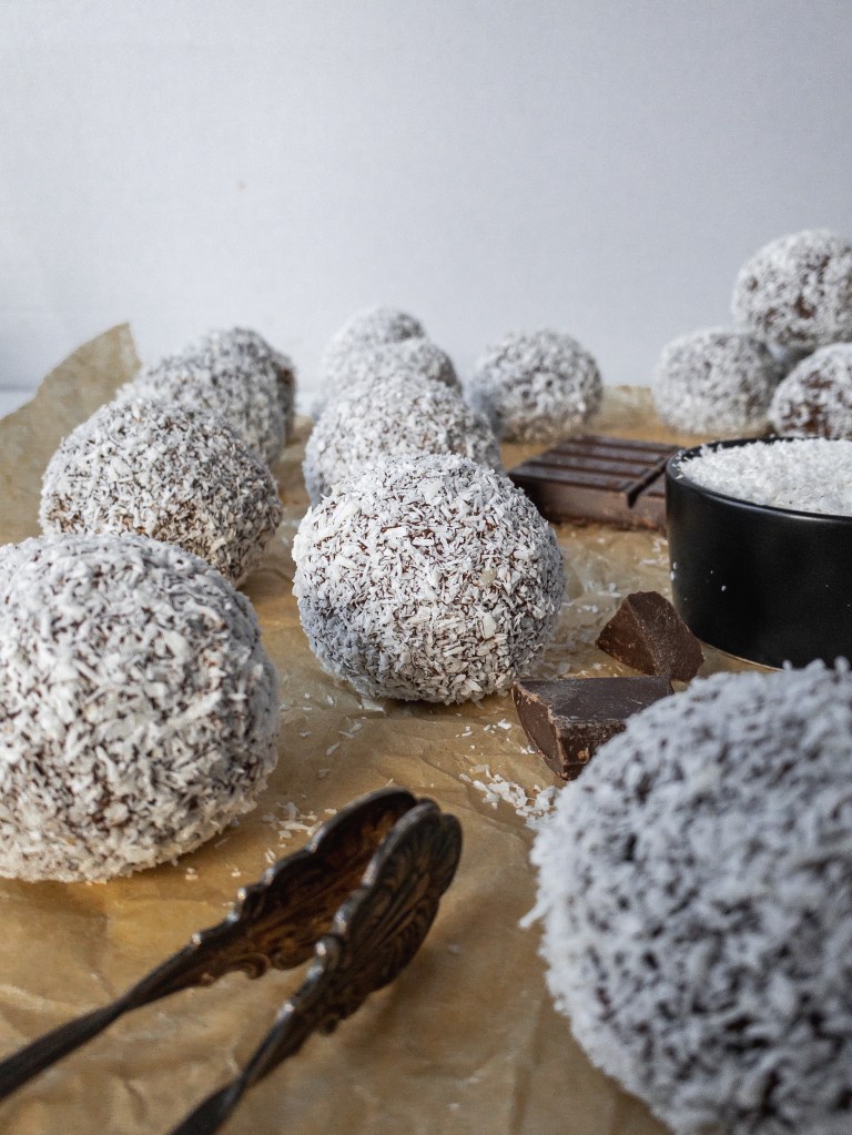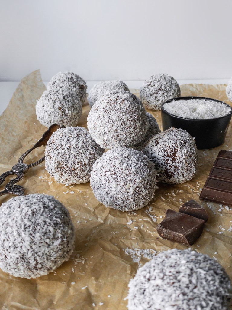 - Rulla bollarna direkt i kokos/pärlsocker innan chokladen stelnar.