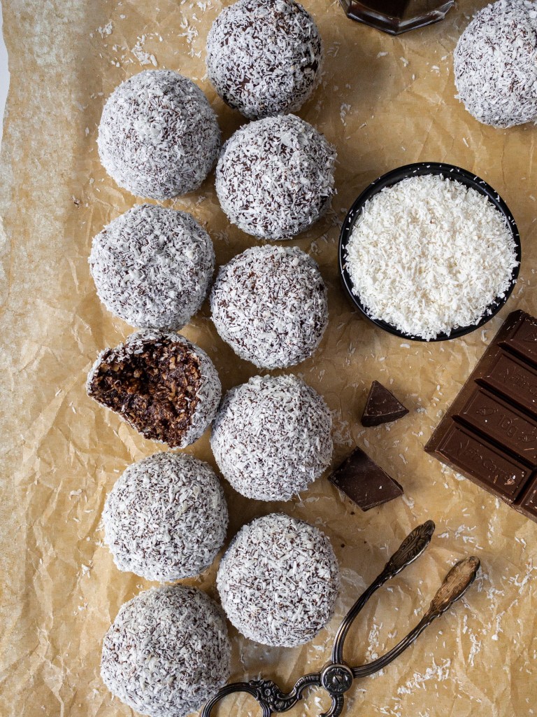 - Ställ in skålen i kylskåpet i ca 30 minuter eller tills den är kyld och har fått en fast konsistens. Forma sedan degen till bollar. Jag gör mina ganska stora, så ca 60 g per boll brukar mina väga. Lägg bollarna på en tallrik/skärbräda med bakplåtspapper, ställ sedan in i kylen i 30 minuter. (Om du inte vill doppa i choklad så rullar du bollarna direkt i kokos/pärlsocker).