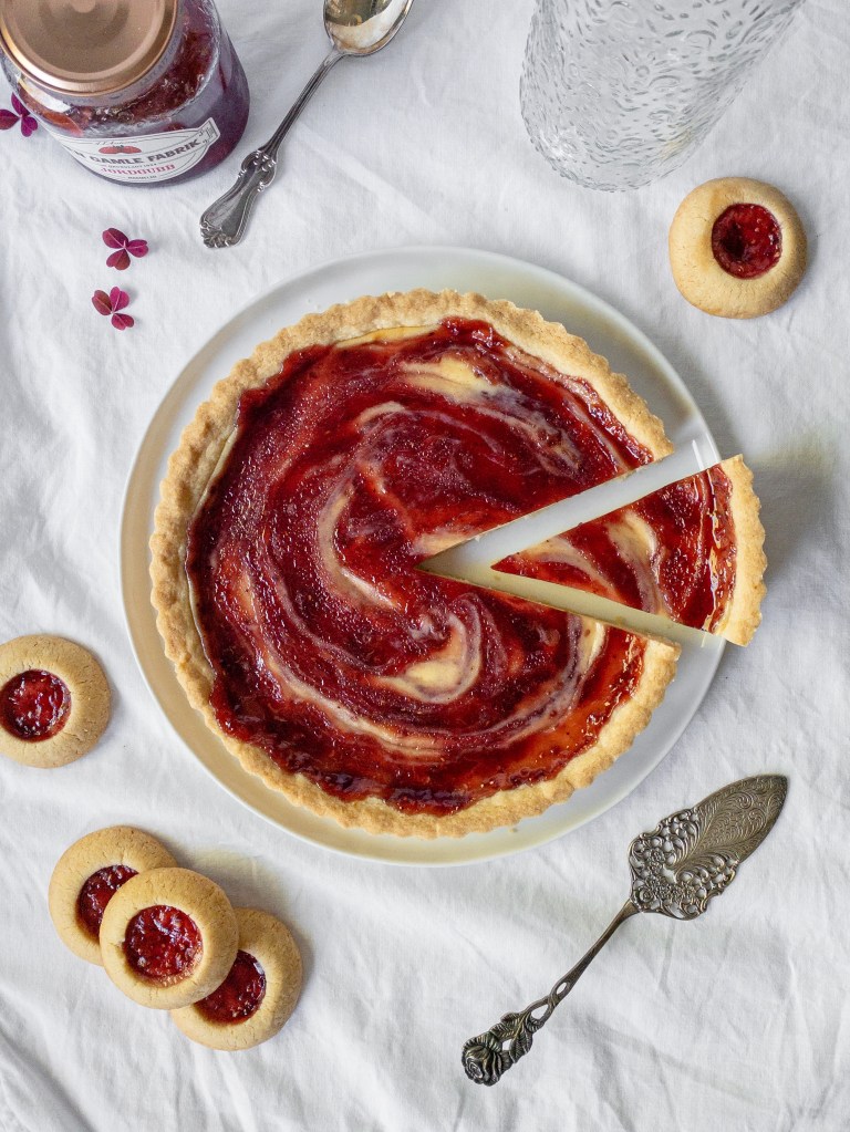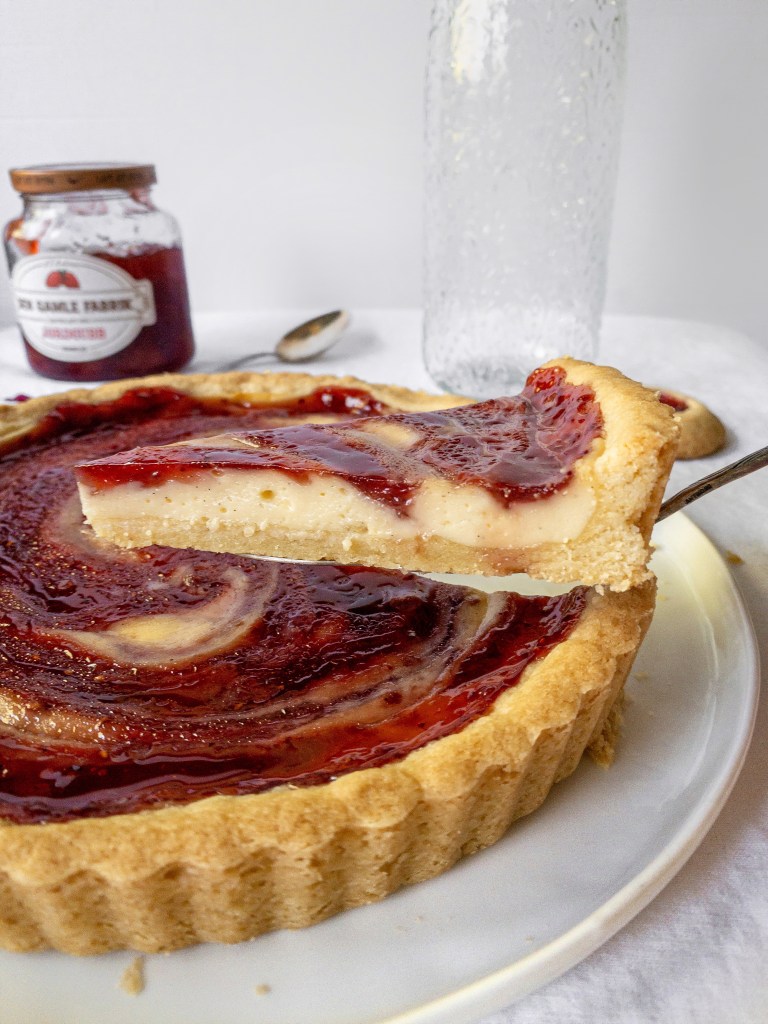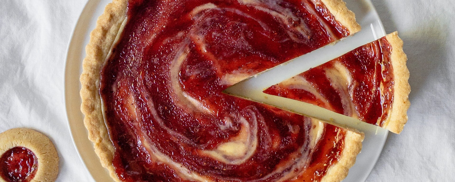 - Häll i vaniljkrämen och sprid ut jämt. Klicka eller spritsa på sylten och dra med baksidan av en sked så att det blir ett fint marmorerat mönster.