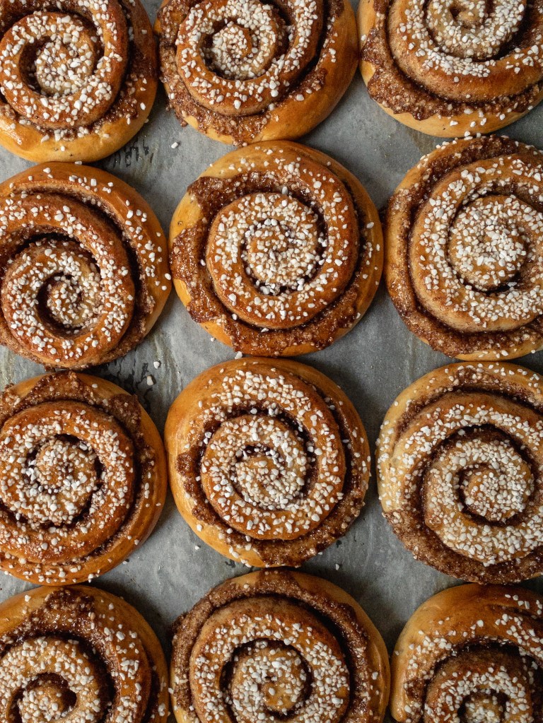 What’s a kanelbulle? It’s a wonderful, delicious cinnamon bun that every swede loves. A soft, fluffy and moist cardamom dough with a sweet, buttery and sticky cinnamon filling and topped with crunchy pearl sugar. It’s by far swedens most popular and beloved buns. You can find it at every café and grocery stores and even at gas stations. I, like most of the people in Sweden, has grown up with kanelbullar. It even has it’s own day! On october 4, the bun is celebrated and baked all over the country. It’s one of the most busiest day for the bakeries and cafés in sweden.