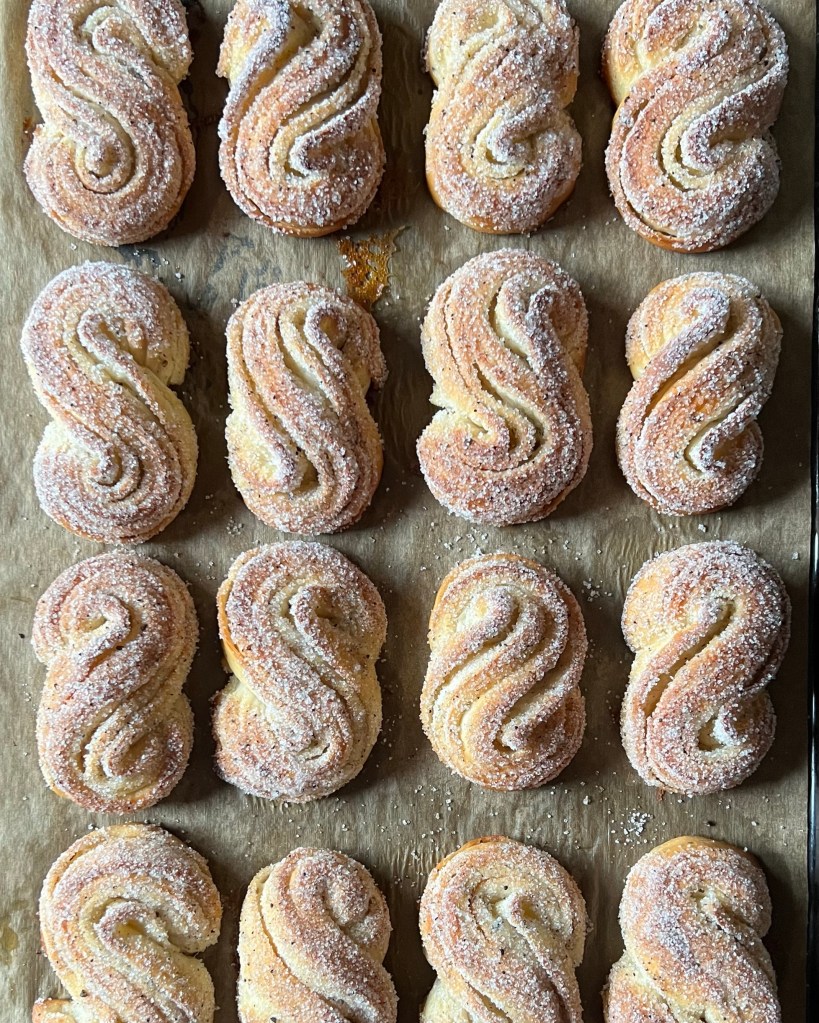 - Kavla och forma degen till valfri form. Om du vill göra samma som mina på bilderna, gör så här: Kavla ut degen till en rektangel (ca 25×55) och bre ut fyllningen jämt över hela degen. Gör ett treslag: börja från ena kortsidan och vik in mot mitten, vik sedan den andra sidan över den andra så att du har tre lager. Vrid degen så att du har långsidan mot dig och kavla degen igen för att bli av med luftbubblor och för att göra degen lite längre. Skär degen i ca 2-2,5 cm breda remsor. Lägg remsan på bordet och vik den dubbelt, så att du får 6 lager. Vänd den så att den skurna sidan ligger uppåt. Nu ska du forma den som en 8:a, men tänk på att ändarna ska ligga i mitten av åttan och på undersidan, samt att den skurna sidan alltid ligger vänd uppåt. Platta till/tryck till så att ändarna fäster under bullen så att de inte åker ut under gräddning. (Det kommer finnas en video på min TikTok och Instagram där jag visar hur jag formar bullarna.)