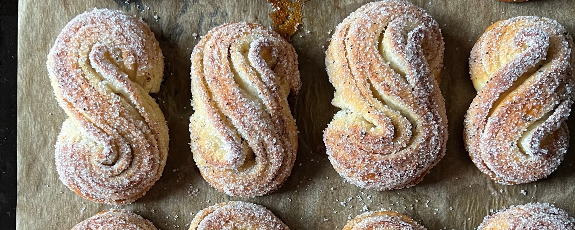 - Kavla och forma degen till valfri form. Om du vill göra samma som mina på bilderna, gör så här: Kavla ut degen till en rektangel (ca 25×55) och bre ut fyllningen jämt över hela degen. Gör ett treslag: börja från ena kortsidan och vik in mot mitten, vik sedan den andra sidan över den andra så att du har tre lager. Vrid degen så att du har långsidan mot dig och kavla degen igen för att bli av med luftbubblor och för att göra degen lite längre. Skär degen i ca 2-2,5 cm breda remsor. Lägg remsan på bordet och vik den dubbelt, så att du får 6 lager. Vänd den så att den skurna sidan ligger uppåt. Nu ska du forma den som en 8:a, men tänk på att ändarna ska ligga i mitten av åttan och på undersidan, samt att den skurna sidan alltid ligger vänd uppåt. Platta till/tryck till så att ändarna fäster under bullen så att de inte åker ut under gräddning. (Det kommer finnas en video på min TikTok och Instagram där jag visar hur jag formar bullarna.)