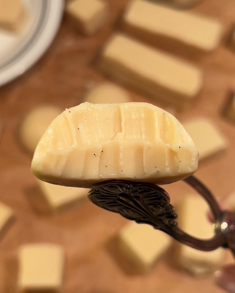 - Skär upp fudgen i lagom stora bitar (om den skulle vara mjuk så kan du ställa in den i frysen en stund).