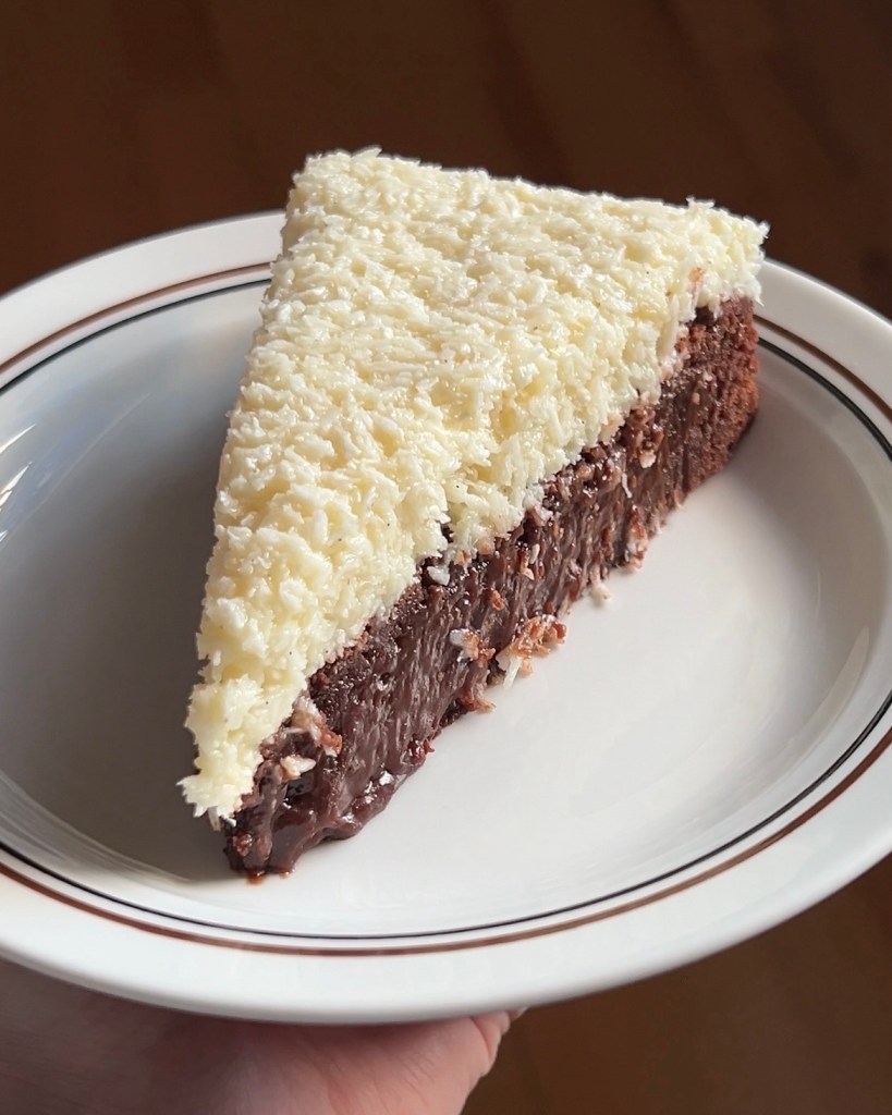 En gudomligt god kladdkaka med ett tjockt lager av krämig kokossmet smaksatt med vanilj. En av de absolut godaste kladdkakor jag någonsin ätit. SÅ god! Man skulle också kunna kalla den för en bountykladdkaka, men då ska man kanske ha ett lager av mjölkchoklad också för att den verkligen ska vara ”bounty-ig”. Jag valde dock att inte ha det, då jag ville ha ett ordentligt kokoslager som får stå i lika mycket i centrum som kladdkakan. Kladdkakan är redan väldigt chokladig, och att då ha ännu mer choklad uppe på hade nog tagit över för mycket. Men det är en smaksak!